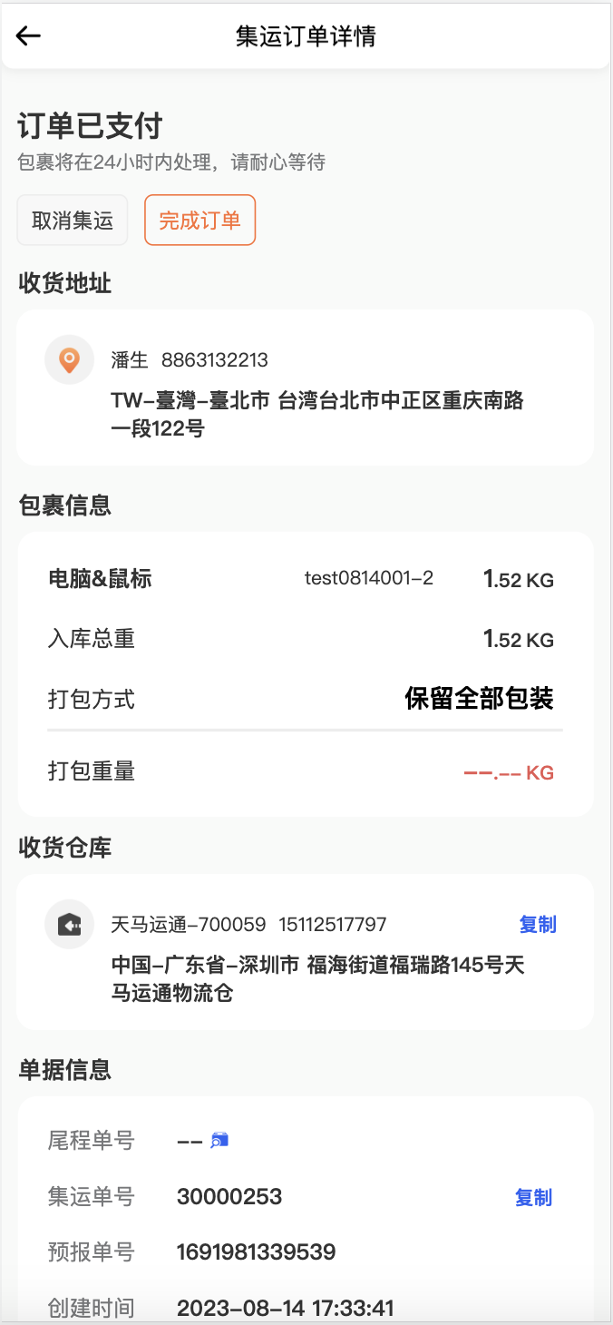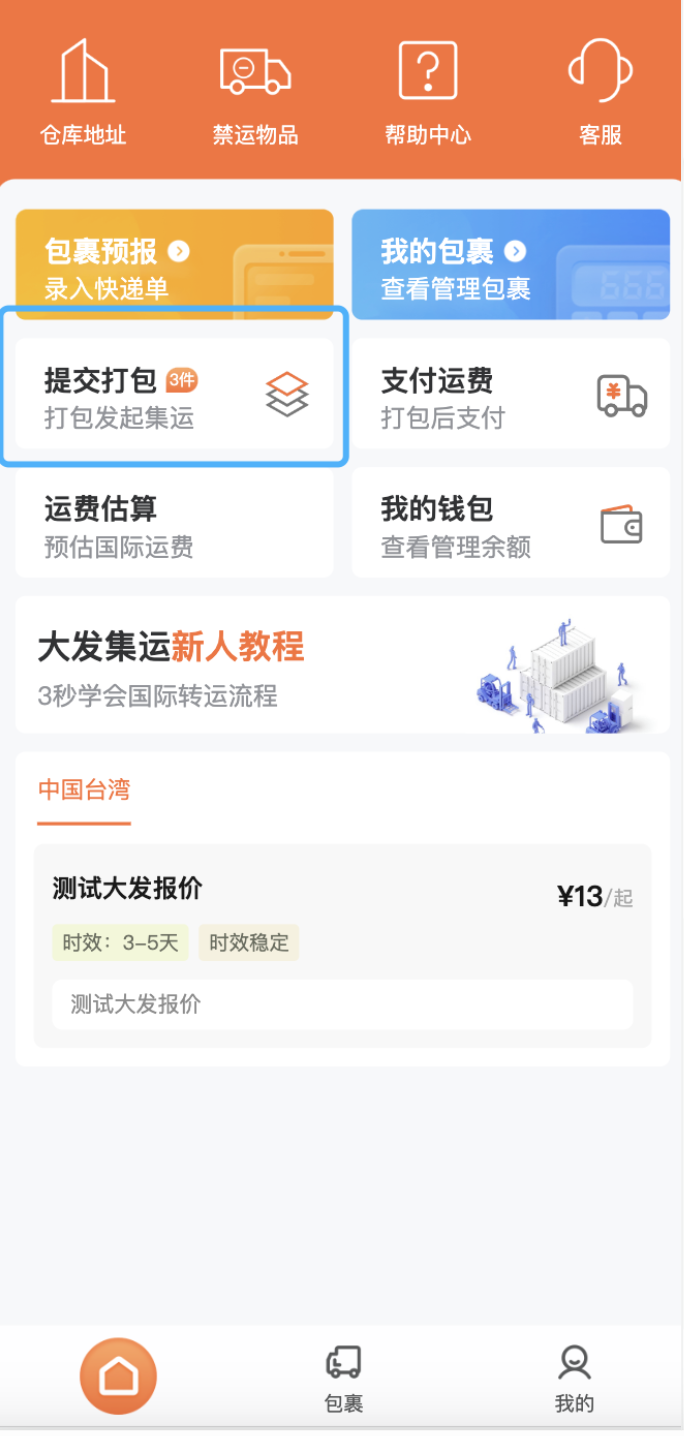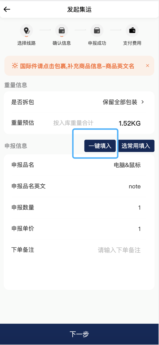 勾选快递单号,点古申請集运,选择下一步。完善包裹信息